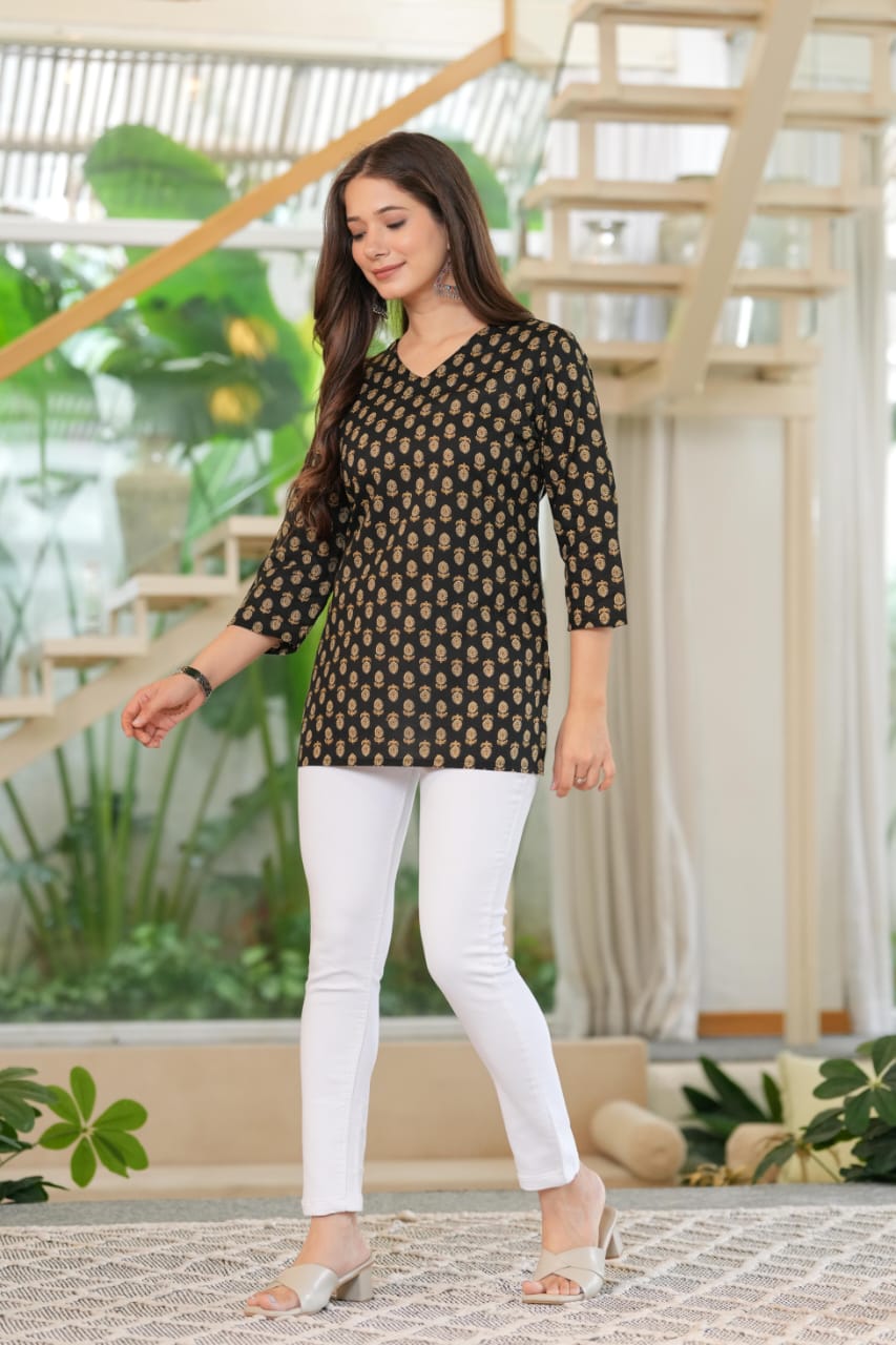 Elevate your ethnic wardrobe with this stunning black cotton V-neck top featuring exquisite golden paisley motifs that create a perfect blend of traditional artistry and contemporary style. This beautifully crafted tunic showcases an all-over paisley pattern in rich gold tones against a sophisticated black base, making it an ideal choice for women who appreciate timeless ethnic elegance.
