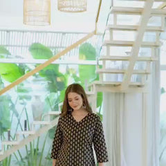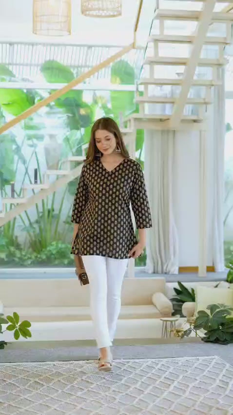 This paisley print V-neck cotton tunic is ideal for women who love traditional Indian motifs with a contemporary twist. The rich black and gold color combination makes it incredibly versatile for pairing with jeans for a fusion look or ethnic bottoms for traditional styling.
