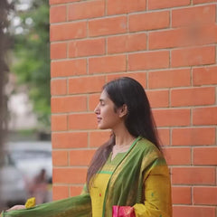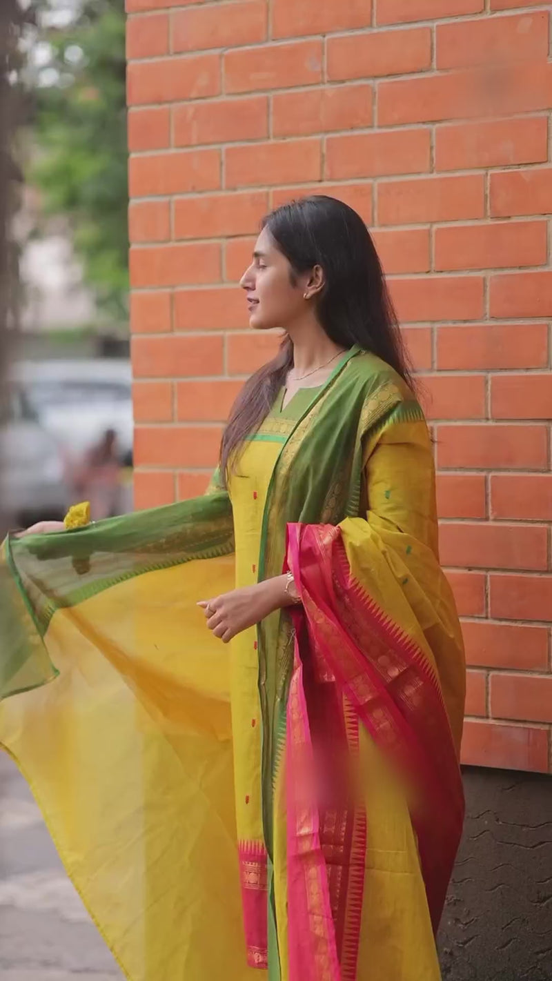 Experience the grace of tradition with our Kanchi Cotton Suit Set, crafted with rich South Indian weaving techniques and vibrant color detailing. The kurta features a beautiful mustard–green combination with traditional motifs, paired with a soft dupatta carrying the same elegant border work. This breathable and lightweight fabric offers all-day comfort while enhancing your ethnic wardrobe with timeless charm.