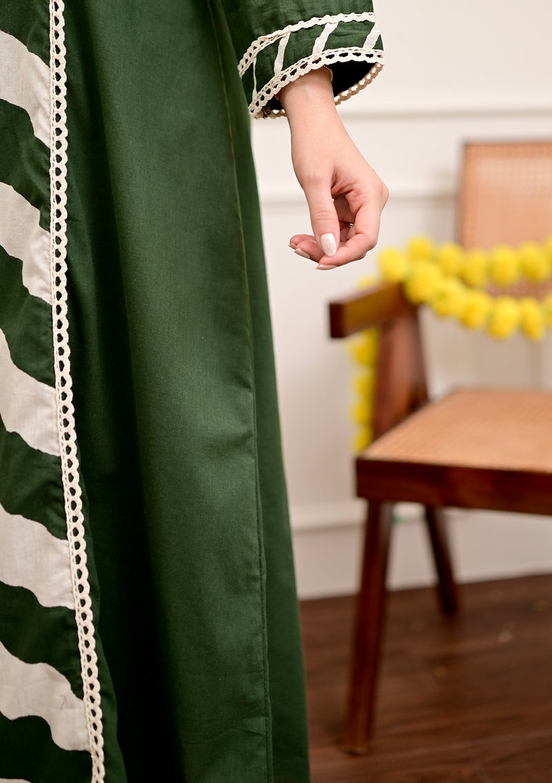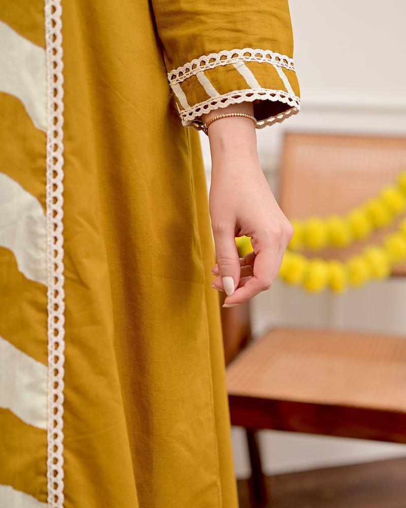 Elevate your festive style with this pure cotton A-line suit set, beautifully detailed with embroidery and lacework — perfect for Diwali outings and elegant gatherings.