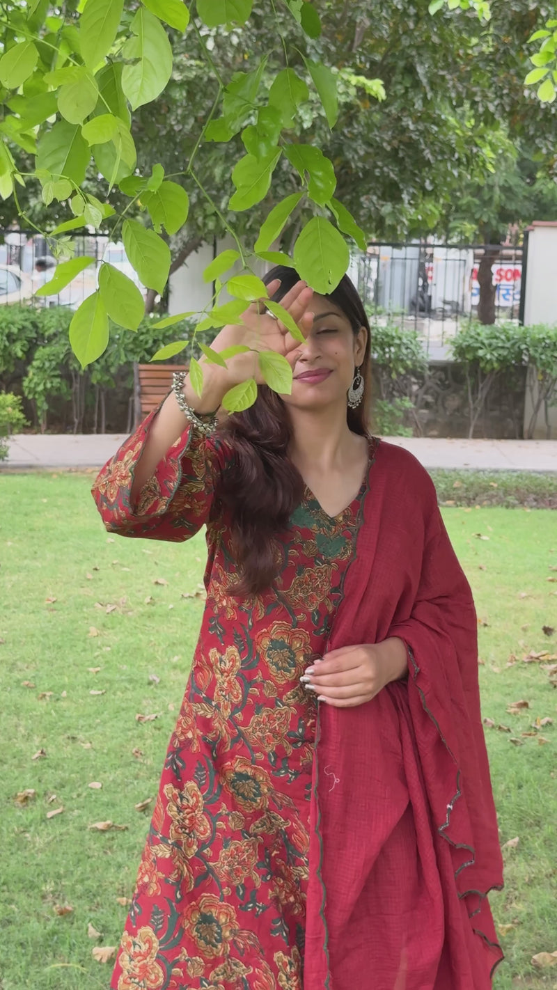 A vibrant red floral printed kurta set with matching pants and dupatta. Crafted from breathable cotton, this stylish three-piece suit is perfect for festive gatherings, casual outings, and everyday elegance.