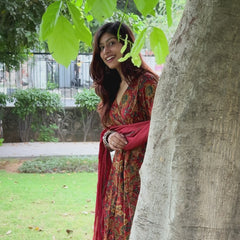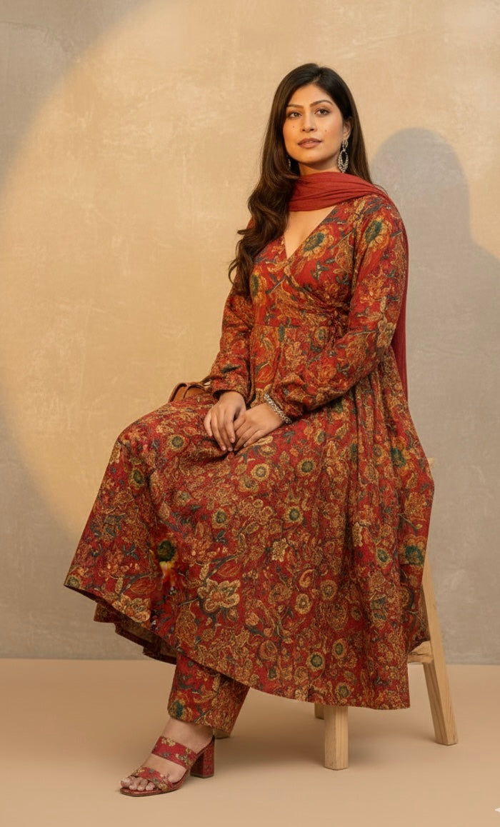 Rust Red Full Flair Cotton Anarkali Kurti with Pant & Dupatta