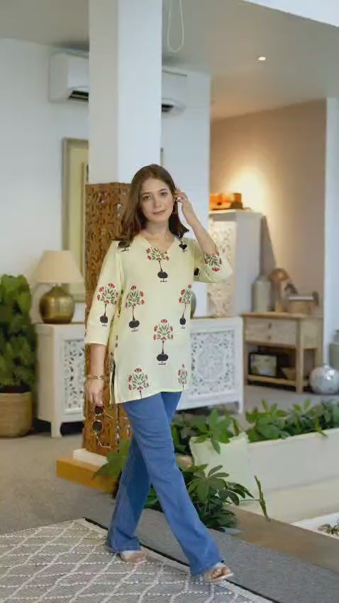 Yellow Cotton V-Neck Floral Print Top - Pure Cotton – Tushita Vibes - Trendy Indian Ethnic Clothing Skip to content